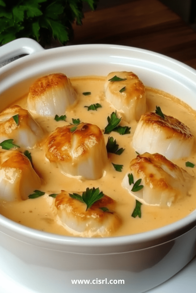 Vous pouvez préparer la sauce et saisir rapidement les noix de Saint-Jacques à l’avance, puis les conserver séparément. Au moment de servir, réchauffez doucement la sauce, ajoutez les noix de Saint-Jacques juste pour les tiédir, puis faites gratiner si vous le souhaitez. Évitez toutefois de trop les recuire.