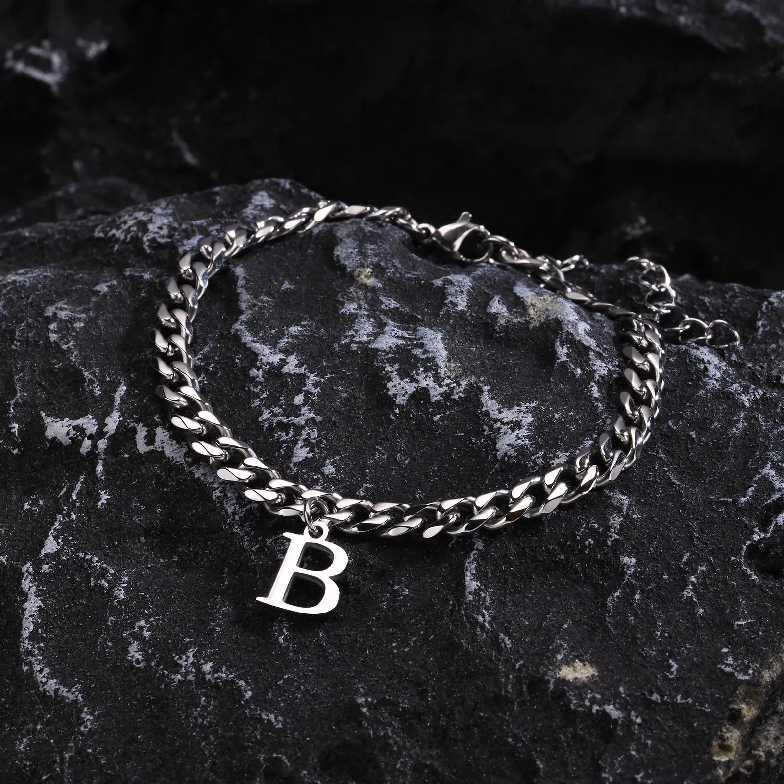 Mens Initials Cuban Links Bracelets,Stainless Steel A-Z 26 Letters Alphabet Charm Chain Wristband Adjustable,Casual Jewelry Gift
